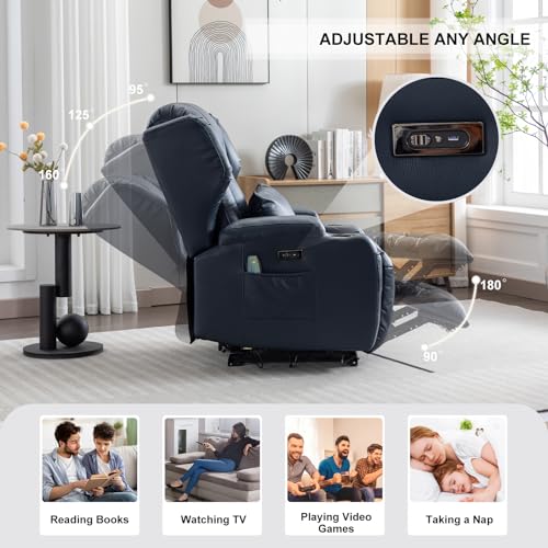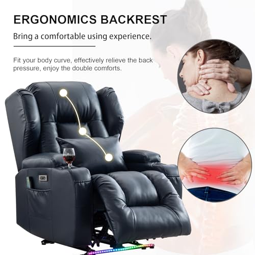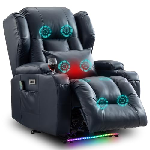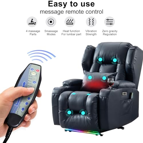/ Electric Chair Recliner Home Theater Seating w/Heat Massage Breathable Leather Overstuffed Movie Gaming Sofa Reclining Chair w/LED Light/Lumbar Pillow/USB Port/Cup Holders/Pockets (1 PC, Blue)