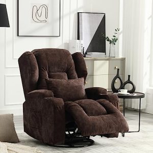 Swivel Rocking Recliner Chair, 360 Degree Swivel Recliners Soft Velvet Manual Glider Rocker Single Sofa Chair for Living Room with Cup Holders/Side Pockets/Free Pillow (Brown)